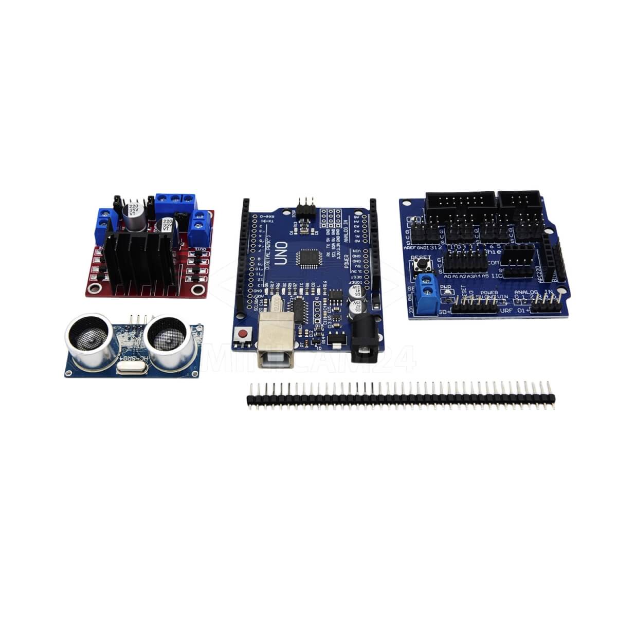 Набор для моделирования Ардуино (Arduino) 2WD Car Robot Lafvin – конструктор для сборки машинки-робота. Набор подойдет начинающим робототехникам, а также опытным инженерам. Конструктор включает в себя плату, датчики, модули, двигатель, колеса, провода. По итогу работы сборщик получит машинку, которая сможет объезжать препятствия, двигаться по заданной траектории, выполнять развороты. Управлять роботом можно с пульта или со смартфона по Bluetooth. Не требует пайки.